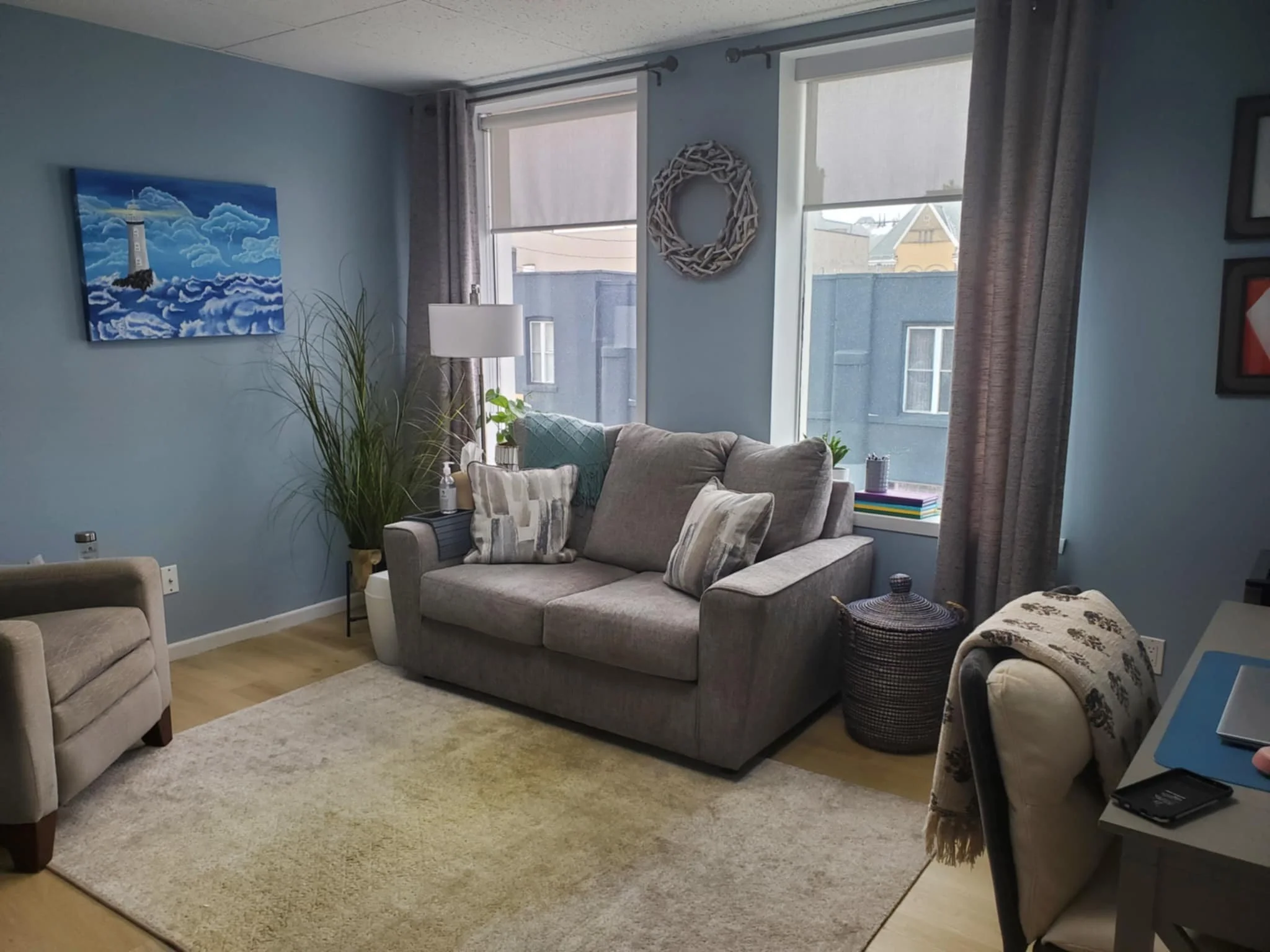 My office is a cozy space located on the third floor of a building in downtown St Thomas. While it is unfortunately not elevator accessible, it has been thoughtfully created with intention. I believe that the spaces we inhabit reflect who we are. With that in mind, I designed this space to feel safe, inviting, and nurturing. The objects throughout the office are not random; they carry meaning and warmth, contributing to an environment that supports reflection, comfort, and meaningful therapeutic work.